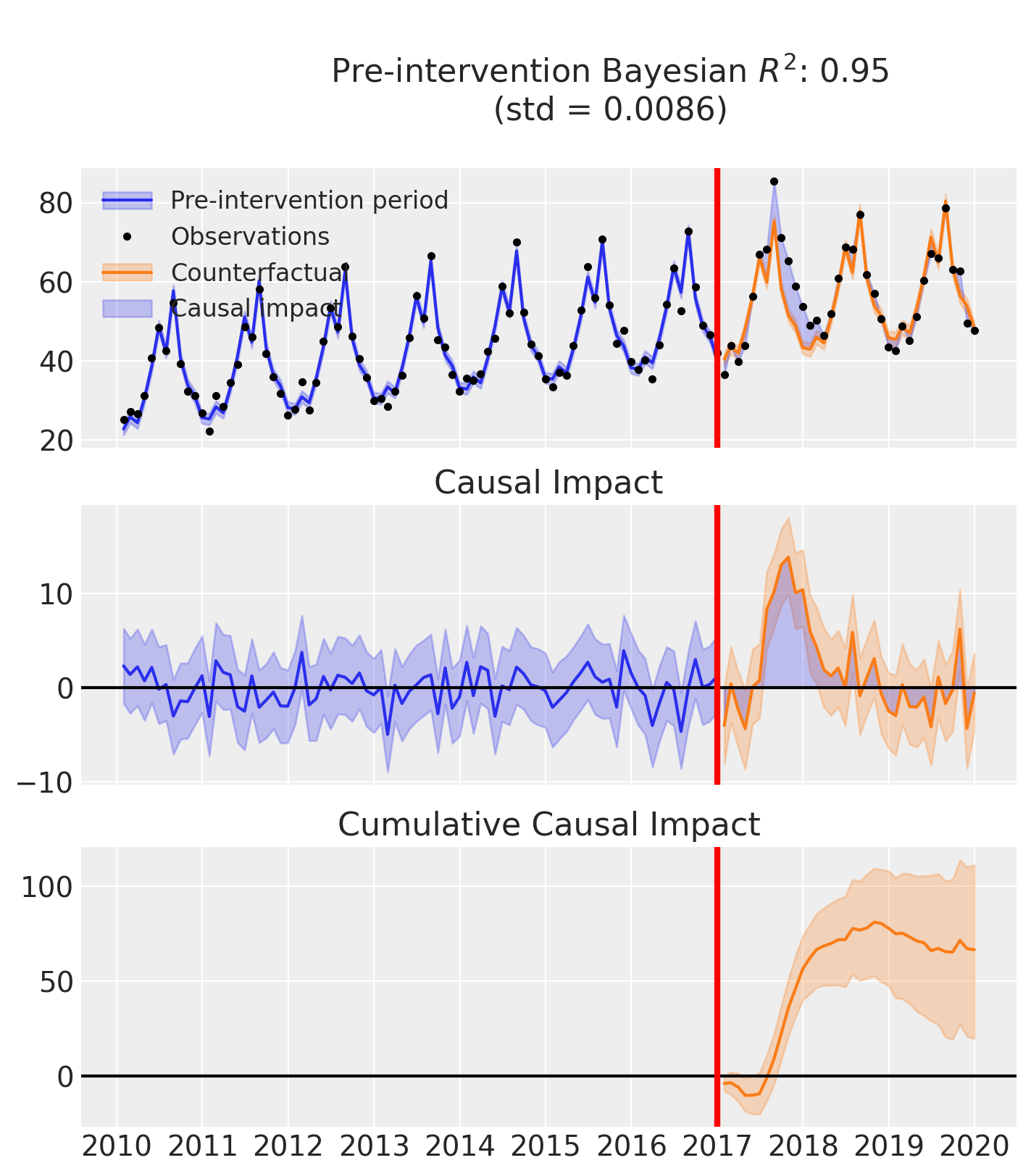 Care must be taken with the mean impact statistic. It only makes sense to use this statistic if it looks like the intervention had a lasting (and roughly constant) effect on the outcome variable. If the effect is transient, then clearly there will be a lot of post-intervention period where the impact of the intervention has ‘worn off’. If so, then it will be hard to interpret the mean impacts real meaning.