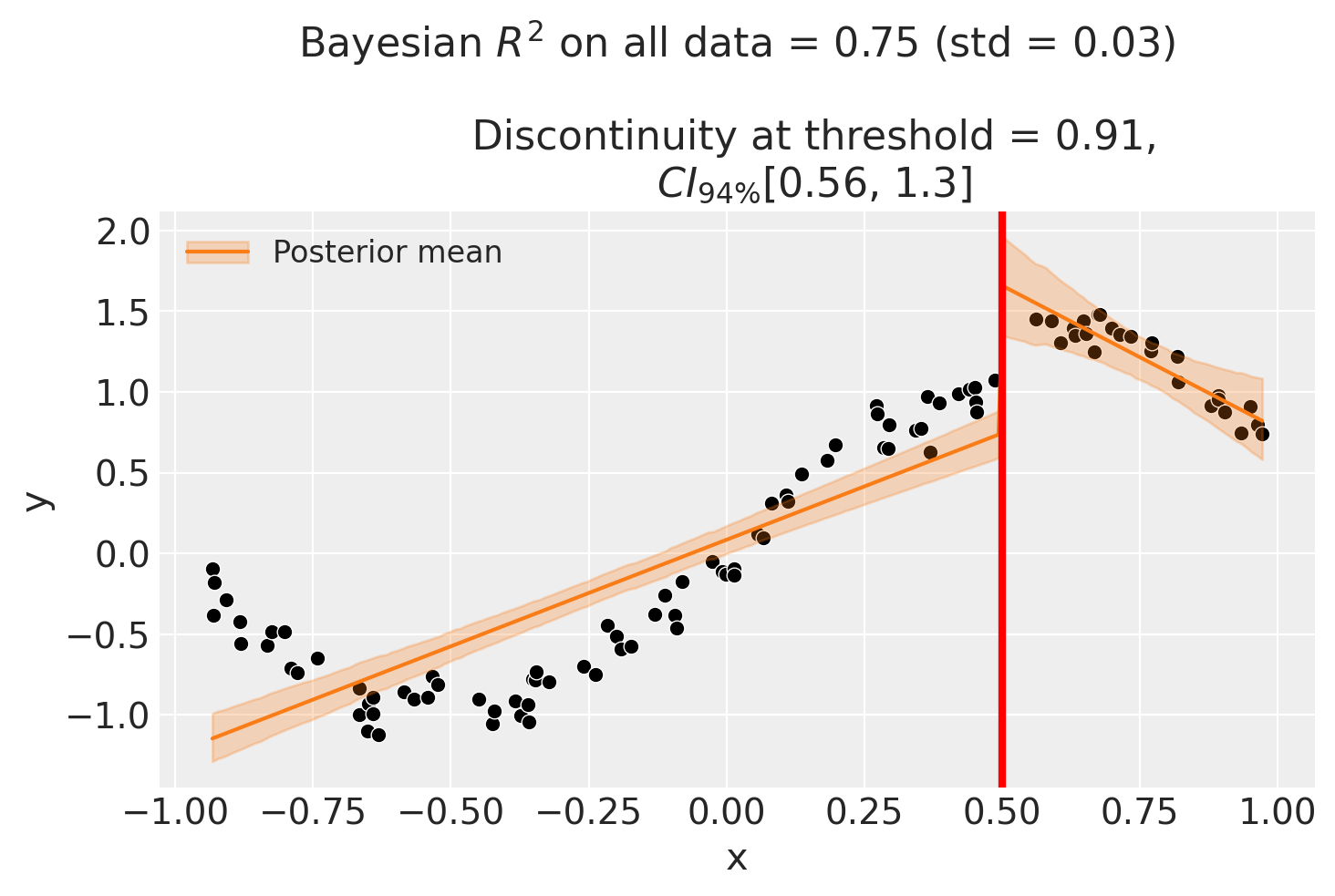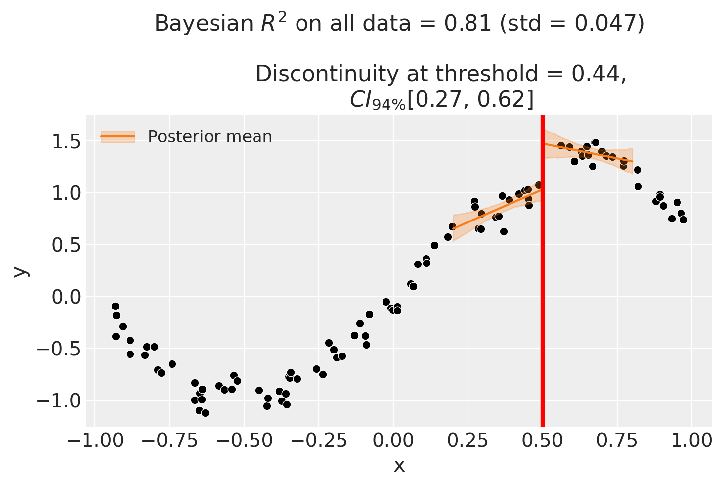kwarg. This will only fit the model to data within a certain bandwidth of the threshold. If \(x\) is the running variable, then the model will only be fitted to data where \(threshold - bandwidth \le x \le threshold + bandwidth\).