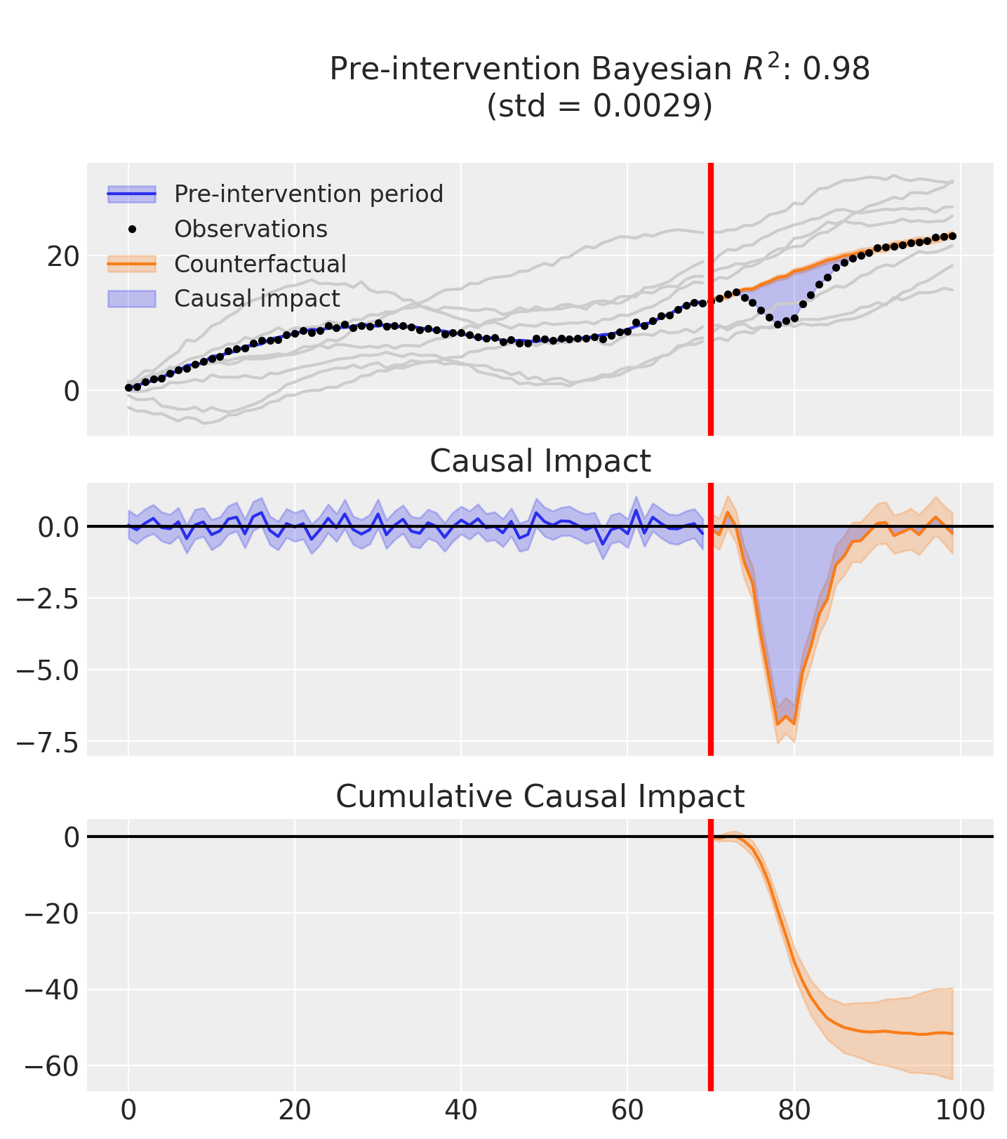 Care must be taken with the mean impact statistic. It only makes sense to use this statistic if it looks like the intervention had a lasting (and roughly constant) effect on the outcome variable. If the effect is transient, then clearly there will be a lot of post-intervention period where the impact of the intervention has ‘worn off’. If so, then it will be hard to interpret the mean impacts real meaning.